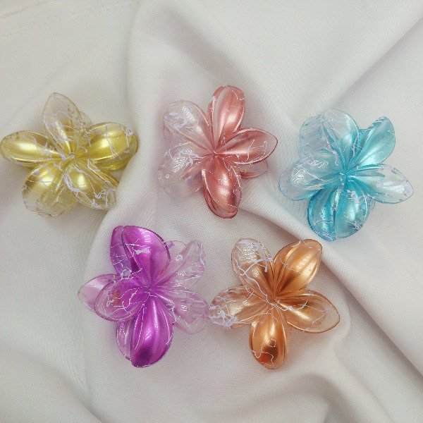 Broches flor hawaiano perlados de distintos colores craquelados.